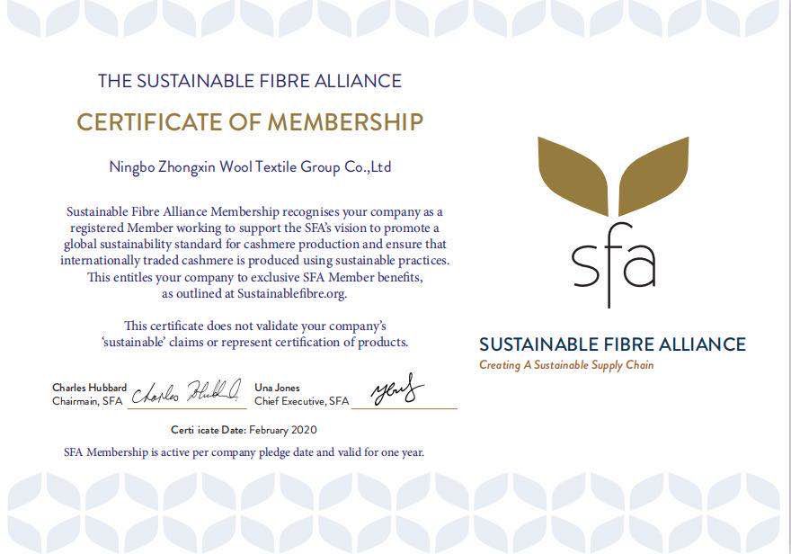 為推進(jìn)羊絨產(chǎn)業(yè)綠色可持續(xù)發(fā)展,寧波中鑫經(jīng)過前期準(zhǔn)備、申請和認(rèn)證,于2020年2月20日正式加入了SFA(Sustainbale Fibre Alliance)組織。