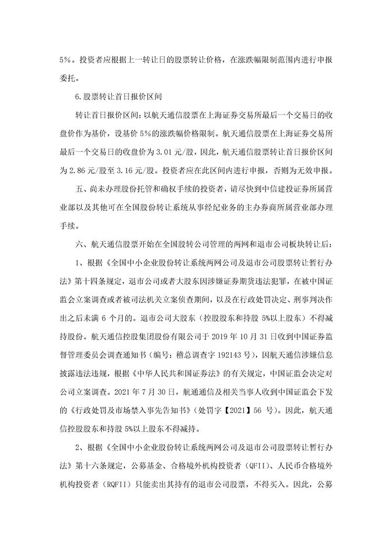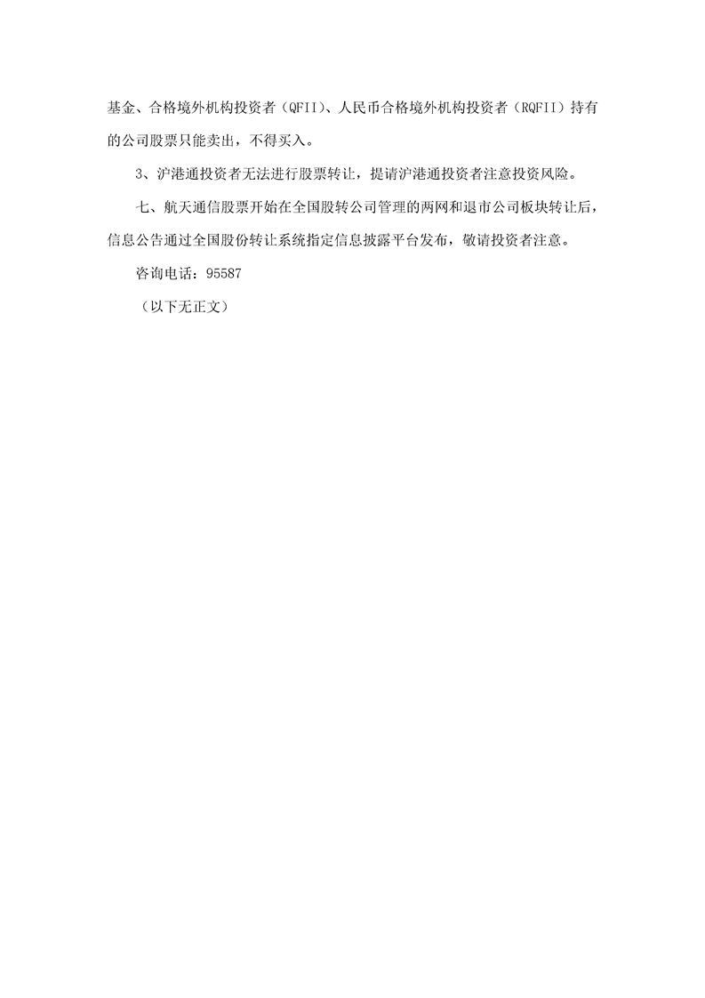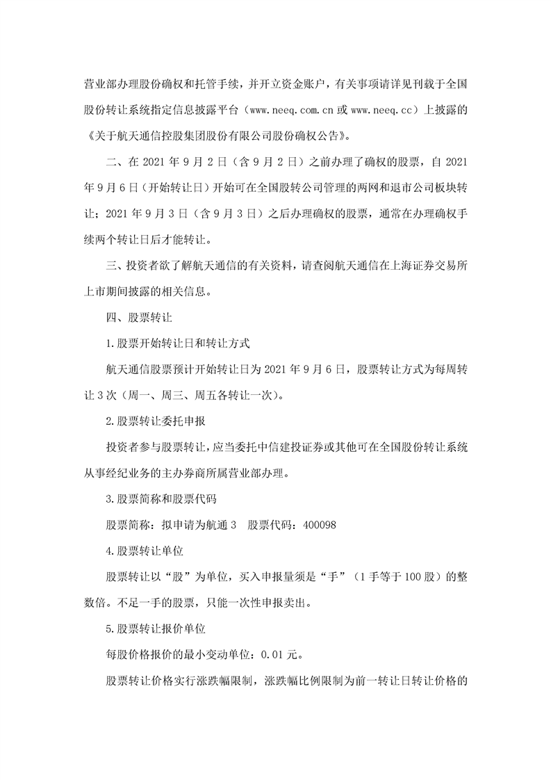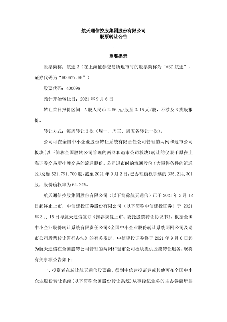 航天通信控股集團股份有限公司股票轉讓公告